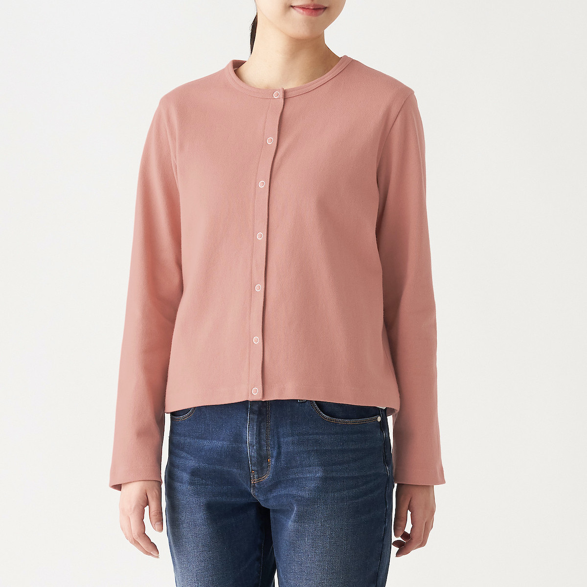 こちらのようなスナップボタンのカーディガンといえばagnes b.の「カーディガンプレッション」が有名ですが、無印良品のこちらのカーディガンのほうが生地感がマットで、ボタンの主張も控えめ。